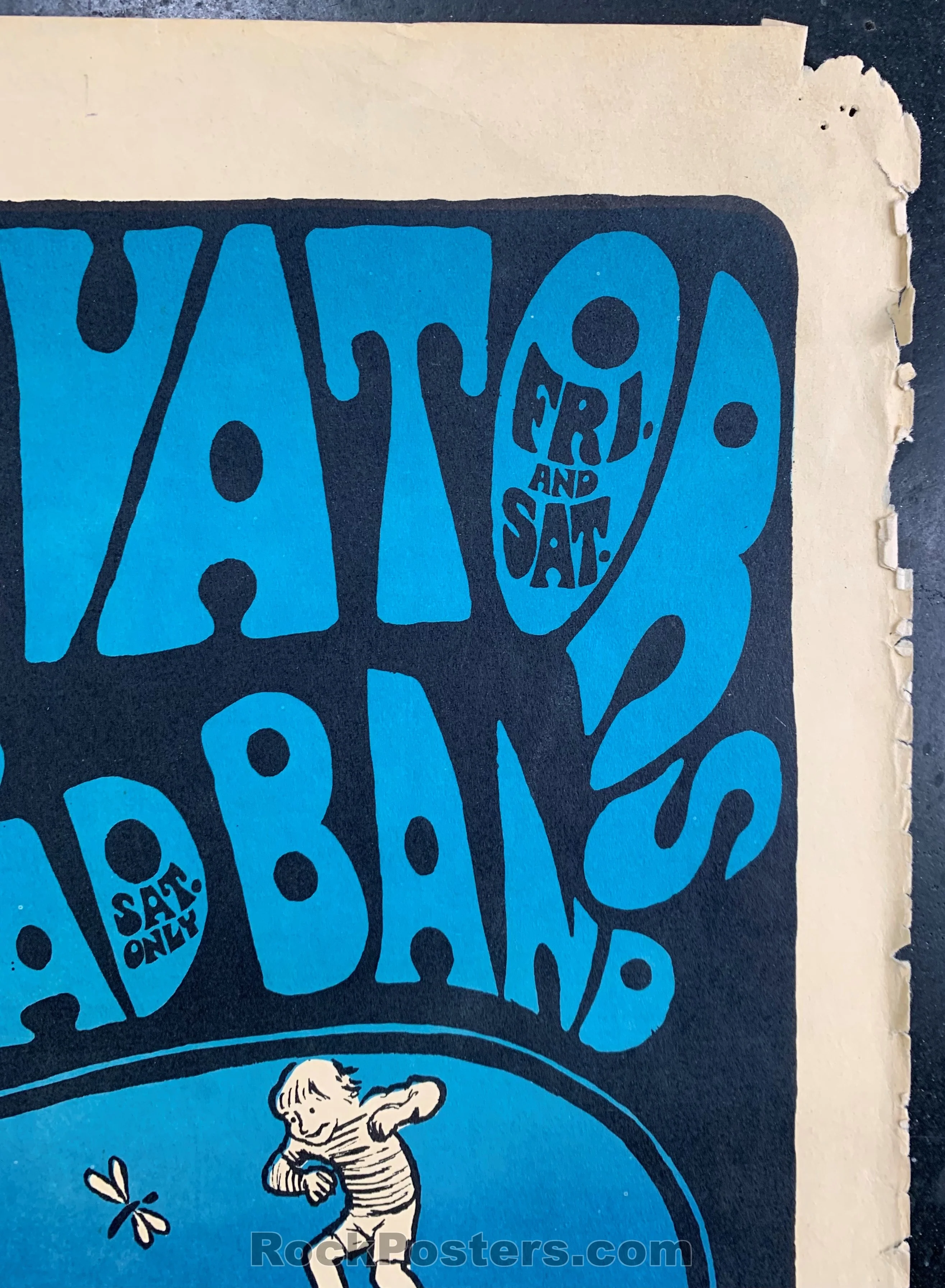 Now here is your chance to own a Texas Holy Grail. This seminal poster by Gilbert Shelton, Texas artist, and creator of the Fabulous Furry Freak Brothers comics. The all Texas bill featured the 13th Floor Elevators, Conqueroo, and Shiva's Head Band. The venue was the fabled Vulcan Gas Company in Austin, Texas and the show dates were November 3rd and 4th, 1967. Gilbert Shelton has populated the piece with pretty much all the Winnie the Pooh characters, along with a few other odd creatures for good measure. A really pretty split fountain, ranging from blue to purple to red. Vulcan gas posters are quite large, generally, and this one measures 22 1/2" X 28 1/2" and is in Very Good condition, with tears, corner wear, wear along the edges, handling, tack holes. Colors remain bright and strong. This poster is extremely rare and highly sought after. An iconic piece of Texas history.
